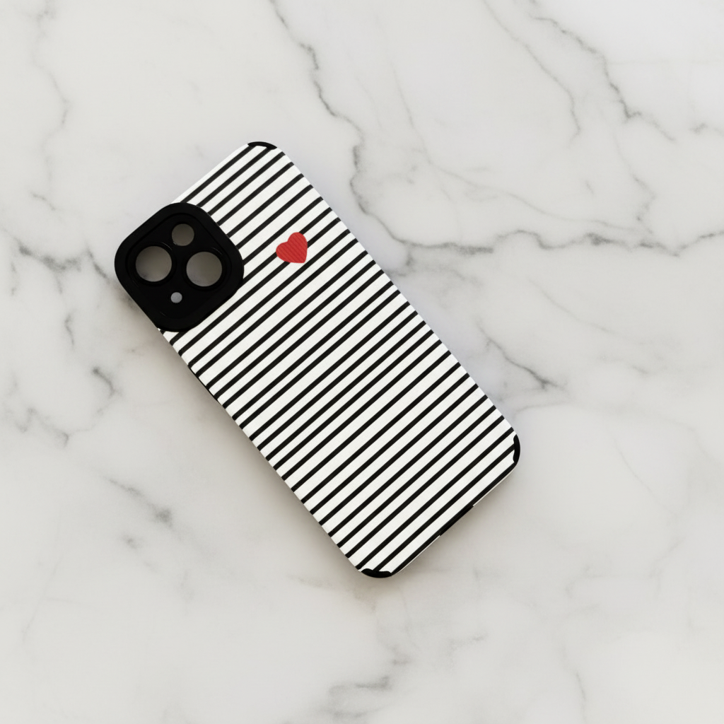 Minimalistisch, aber mit Herz – diese schwarze und weiße Handyhülle im Streifenlook setzt mit ihrem kleinen roten Herz einen charmanten Akzent. Die geriffelte Oberfläche sorgt nicht nur für einen sicheren Halt, sondern auch für einen stylischen Touch. Perfekt für alle, die es gerne schlicht, aber mit einer besonderen Note mögen.