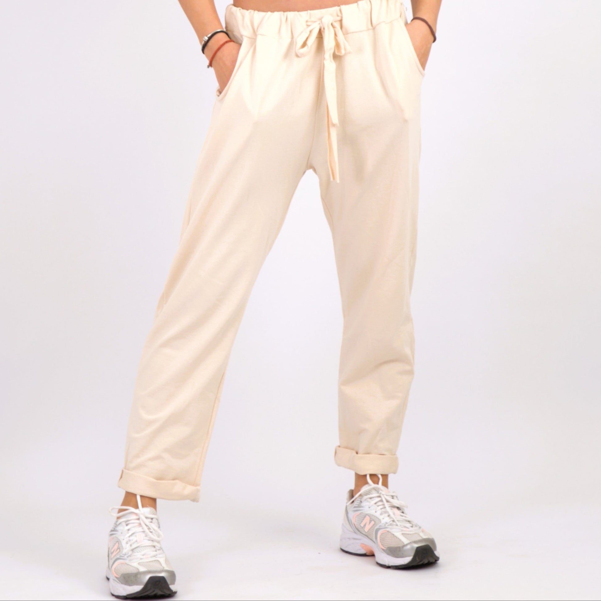 Bequem, luftig und perfekt für wärmere Tage – diese locker sitzende Baumwollhose mit Gummibund und Schleife bietet dir einen entspannten, zurückhaltenden Look. Mit praktischen Taschen und einem weichen Schnitt ist sie ideal für Frühling und Sommer.