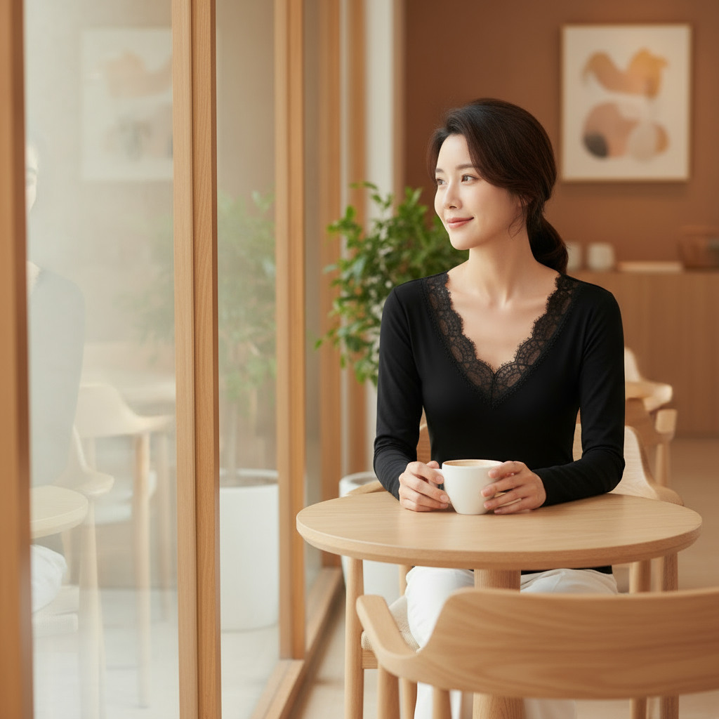 Fein, leicht und besonders: Dieses Langarmtop aus seidigem Modal schmiegt sich sanft an die Haut und zaubert mit zarter Spitze feminine Details. Ideal als edles Basic unter Blazer, Cardigan oder solo für besondere Momente – ein Top, das Leichtigkeit und Stil perfekt vereint.