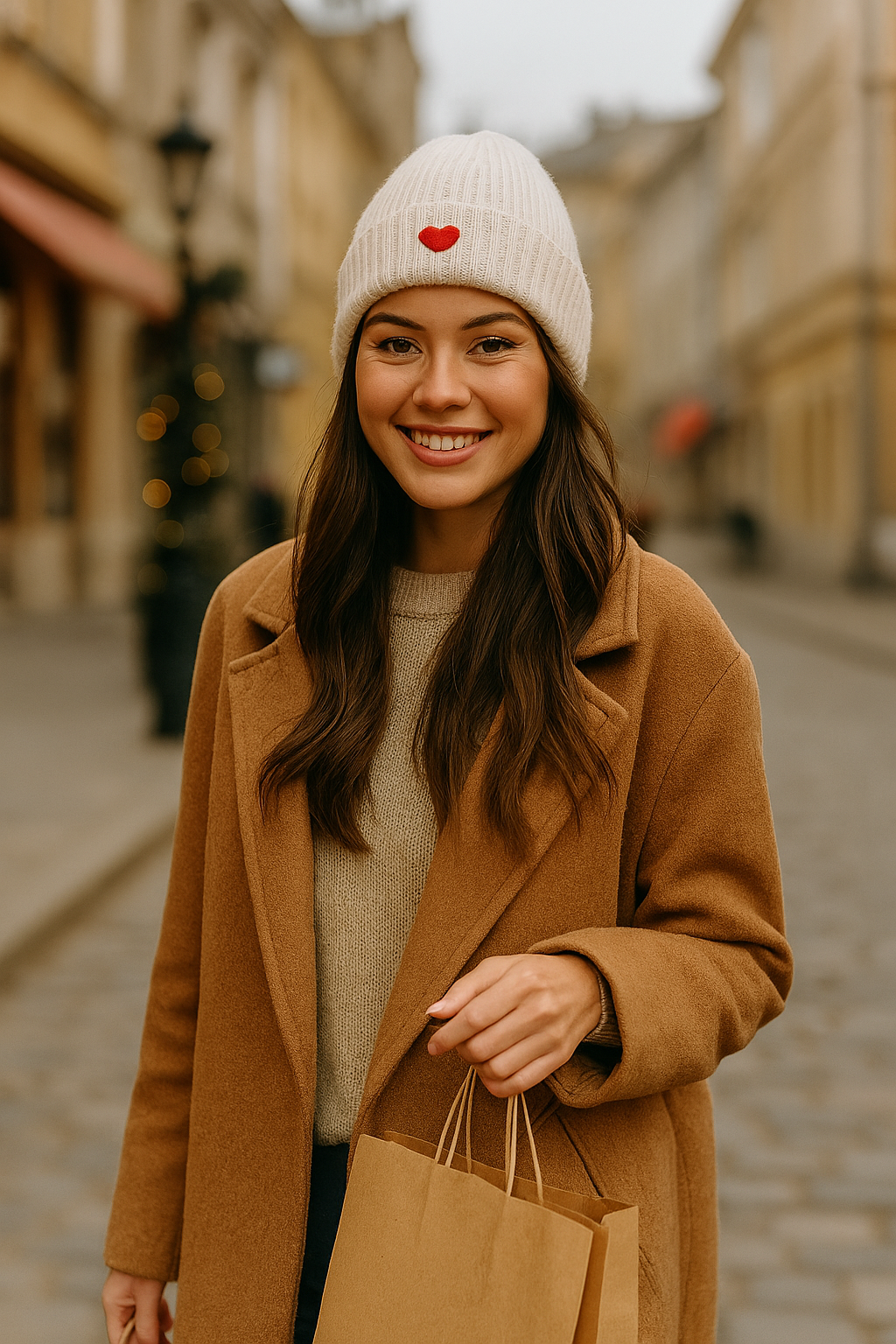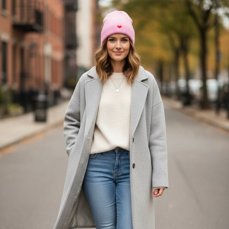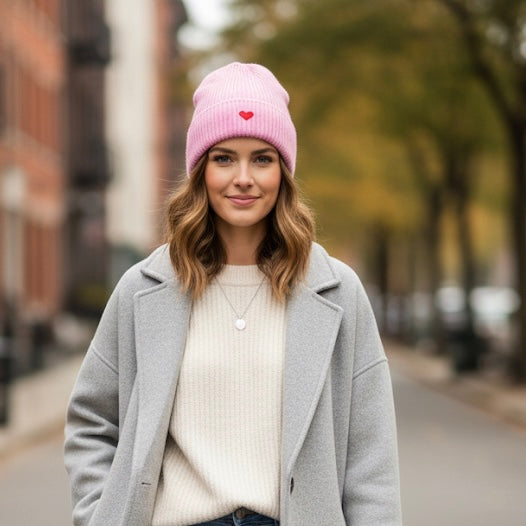 Diese zarte gerippte Wollmütze aus 100% Kaschmir zum umschlagen ist so schön wie kuschelig und mit dem kleinen aufgestickten Herz ein absolutes Lieblingsstück.